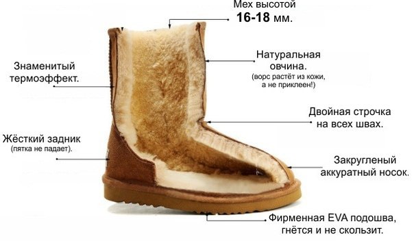 В оригинальных уггах и наружный замшевый/кожаный слой, и внутренний меховой слой составляют единое целое, что обусловлено особенностями устройства самой овчины, из которой шьются сапоги. Если кожа и мех склеены друг с другом, то вы имеете дело с подделкой.